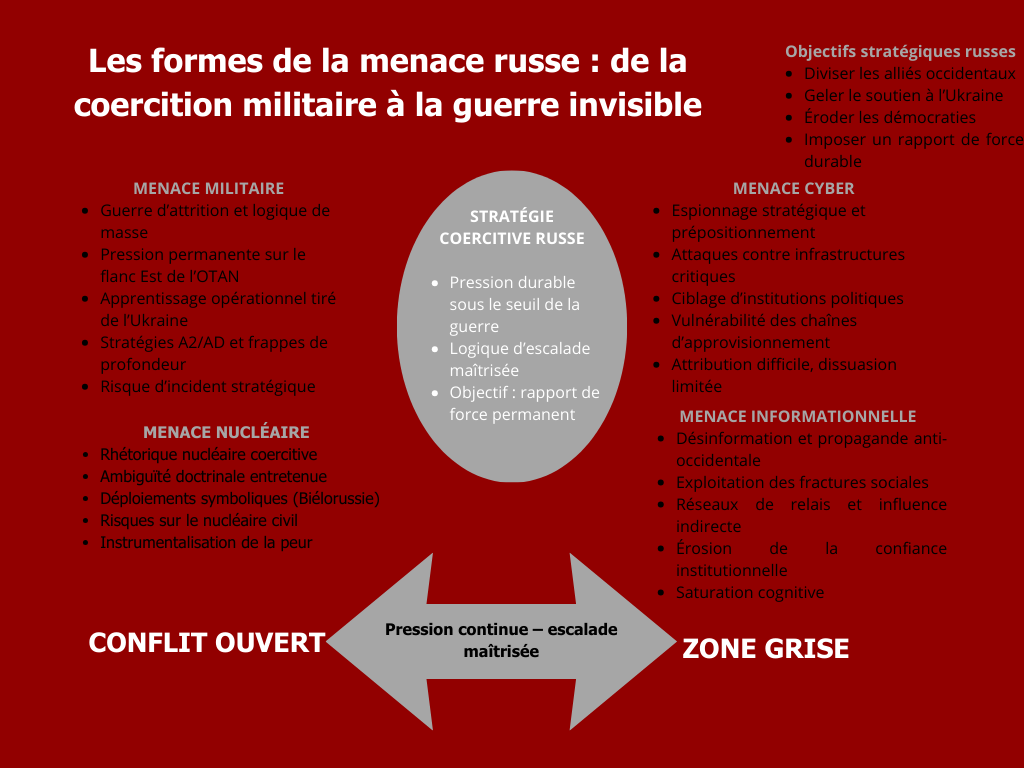Le schéma présenté vise à rendre lisible cette réalité : la Russie ne mène pas uniquement une guerre militaire, mais une guerre multidimensionnelle, combinant coercition armée, actions hybrides, pression informationnelle et instrumentalisation du risque nucléaire, dans une logique assumée de confrontation durable avec les démocraties occidentales.