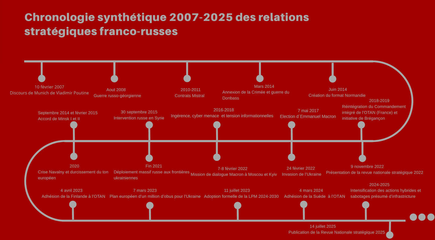 Du discours de Vladimir Poutine à Munich en 2007 à la reconnaissance explicite, en 2025, d’une menace russe durable, multidimensionnelle et structurante pour la sécurité européenne, cette chronologie met en lumière la lente transformation de la Russie en puissance coercitive et révisionniste, ainsi que les difficultés européennes – et françaises – à en tirer toutes les conséquences à temps.