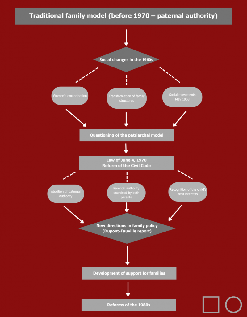 The 1970s were a pivotal period in the evolution of family law in France. Until this period, the legal organization of the family remained largely structured by the principles inherited from the Civil Code of 1804, based on the notion of paternal power. In this context, the father had preponderant legal authority over the children and the family organization, while the mother occupied a legally subordinate position.